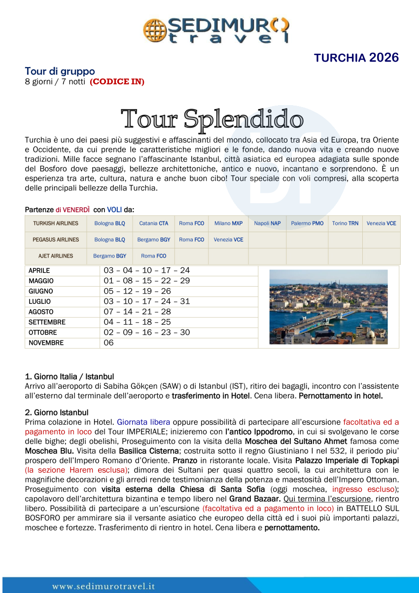 Tour Splendido con volo da bgy, blq, fco, vce, mxp, nap, cta, pmo, trn di venerdì 8 giorni