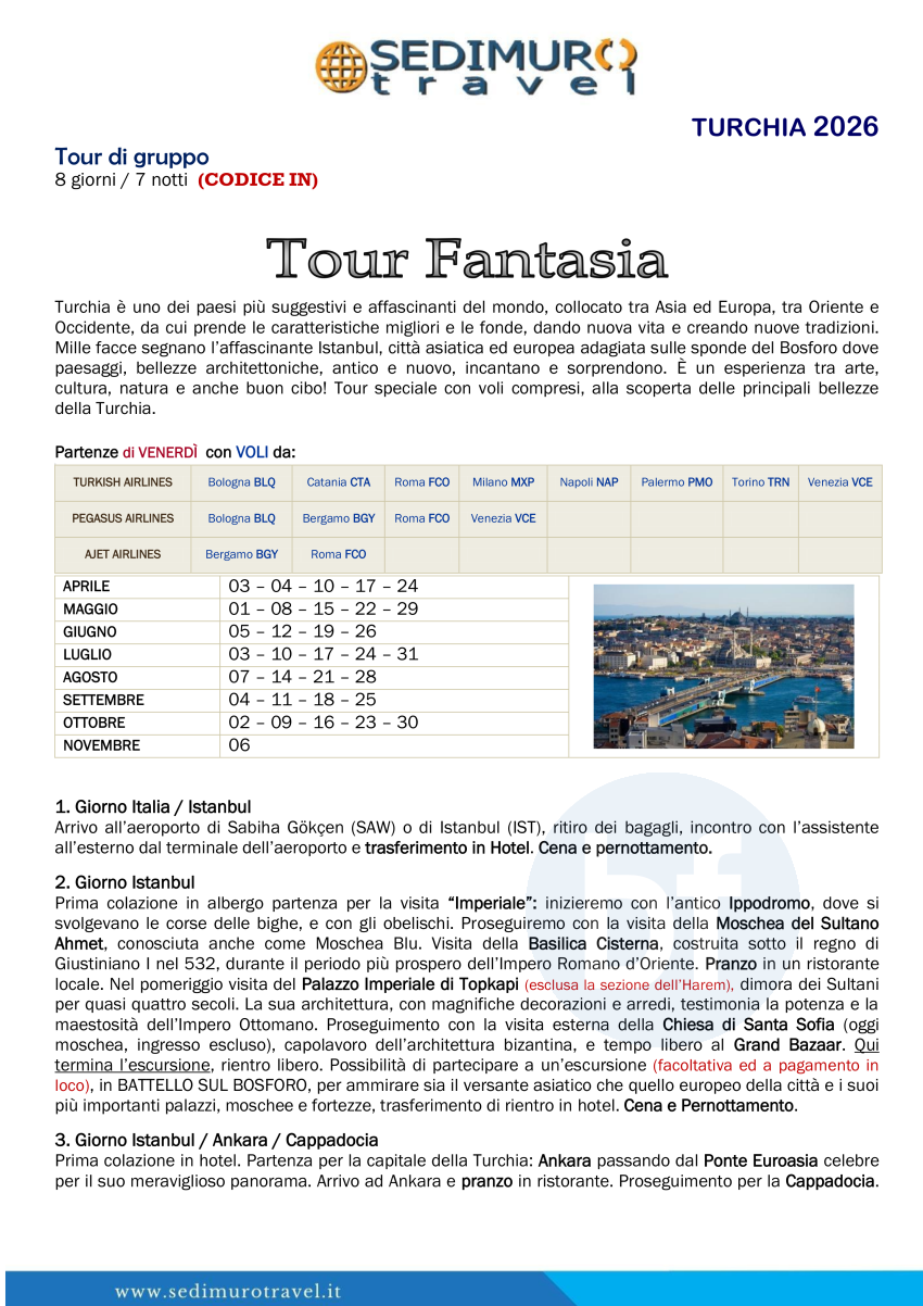 Tour Fantasia con volo da bgy, blq, fco, vce, mxp, nap, cta, pmo, trn di venerdì 8 giorni